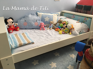 Como debe primar la independencia del pequeño, decidimos buscar una cama pequeñita con las patas cortas. Es cierto que las camas a ras de suelo son muy buena opción para empezar, pero Tití andaba (corría) y se subía y bajaba del sofá sin problemas con 1 año, así que nos decantamos por este modelo de Ikea, me gustaba que tuviese cabecero y piecero acolchado, pero estaba descatalogado. Por fortuna la encontramos de segunda mano y así sólo tuvimos que comprar el colchón.
