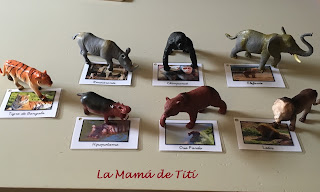 Además de que pensamos volverlas a utilizar cada vez que volvamos a ir a la reserva, en casa hemos empezado a jugar a un juego con las fichas y unos animales de juguete que teníamos. Cierto es que no están todos (compramos el paquete más pequeño, no es cuestión ahora de montar un zoo en casa), pero sacamos las fichas de los animales que sí teníamos y las pusimos en una bandeja junto con los animales que casaban con ellas.