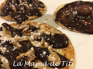 Ahora cada uno escoge lo que quiere ponerles por encima: miel, chocolate, nutella, frutos secos, azúcar glas, sirope de fresa, mermelada… o con una barrita Kinder (así se comió Tití la suya, como un burrito).